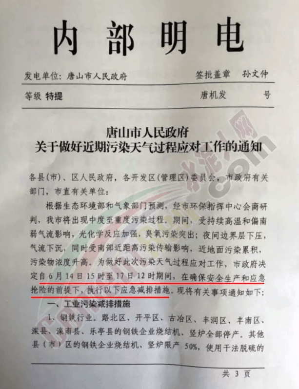日前,唐山市人民政府再发明电《关于做好近期污染天气过程应对工作的通知》称:根据生态环境部和气象部门预测,经市环保指挥中心会商研判,唐山市将出现中度至重度污染过程。期间受持续高温和偏南弱气流影响,光化学反应加强,臭氧污染突出;夜间边界层下压气流下沉,同时受南部近距污染传输影响,近地面污染累积,污染物浓度升高。为做好此次污染天气过程应对工作,唐山市政府决定 自6月14日15时至17日12时期间,在确保安全生产和应急抢险的前提下,执行应急减排措施。