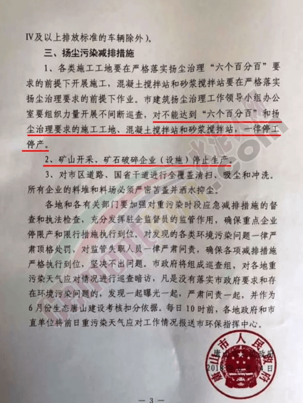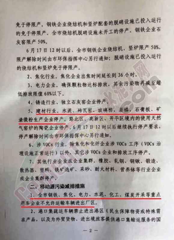 工业减排方面,建材行业,水泥砖瓦窑、石膏板、矿渣微粉生产企业停产;移动源污染减排方面要求全市钢铁、水泥、煤炭开采等重点用车企业不允许运输车辆进出厂区;扬尘污染减排方面要求各类施工工地要在严格落实扬尘治理“六个百分百”要求的前提下开展施工,混凝土搅拌站和砂浆搅拌站要在严格落实扬尘治理要求的前提下作业。对不能达到“六个百分百”和扬尘治理要求的施工工地混凝土搅拌站和砂浆搅拌站,一律停工停产。矿山开采、矿石破碎企业(设施)停止生产。
