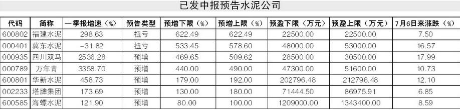 值得注意的是,7月6日,四川双马预计上半年业绩同比大增469.65%-509.62%,冀东水泥则预告中报扭亏幅度高达533.45%-578.60%,已被机构解读为超越之前的预期。