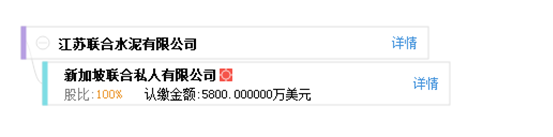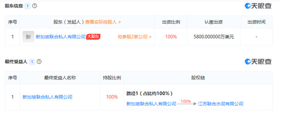 天眼查数据显示,新加坡联合私人有限公司为江苏联合水泥有限公司最大股东,股比100%,或为直接控股方。