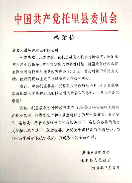 为此,中共托里县委员会、托里县人民政府特发函致谢,对天盾特种水泥公司在本次抗洪抢救灾过程中所做的贡献,县委相关领导对于天盾水泥能够从大局出发,不计企业得失的大局观给予了高度的评价和认可。