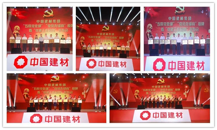 大会上,表彰了徐州中联水泥有限公司制造车间党支部等215个“五好党支部”、成都建材院(埃及GOE Beni Suef项目)电气安装岗等976个“党员先锋岗”,并为代表授牌。发布了山东工陶院136支部工作法等20个“优秀党建工作品牌”,并授牌。对中国巨石党建“三建”工作法、中材国际(南京)海外党建135工作模式、蚌埠院党建“六三”标准工作法、徐州中联“螺丝钉”紧固工程、中复连众“六个工程”、中国建材总院青年科技人才精准化培养工程、南京玻纤院“1+N”党员政治生日活动、北新建材红色标杆计划、贵州三都“三五五”支部工作法、泰山玻纤党群共建“五个一体化”工程等“十佳党建工作品牌”集中展播,宣读评委会评语,并由宋志平同志逐一为入选单位授牌。