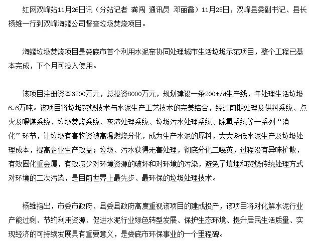 双峰海螺+垃圾焚烧,大量有关称赞该项目的报道