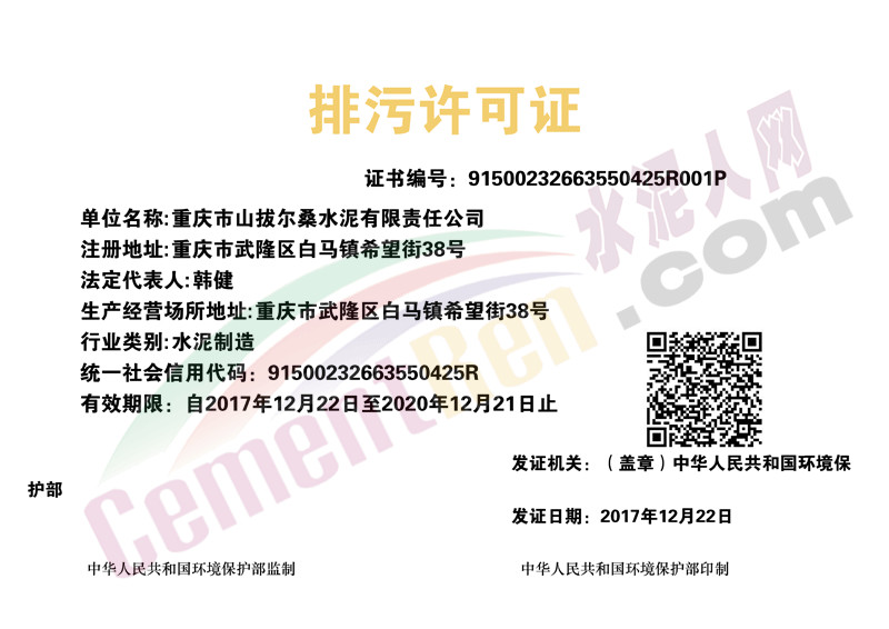 已办理排污许可证(证号:91500232663550425R001P),水泥厂污染治理设施有布袋除尘(33台套)、电收尘(1台),在线监测设备已安装调试运行。