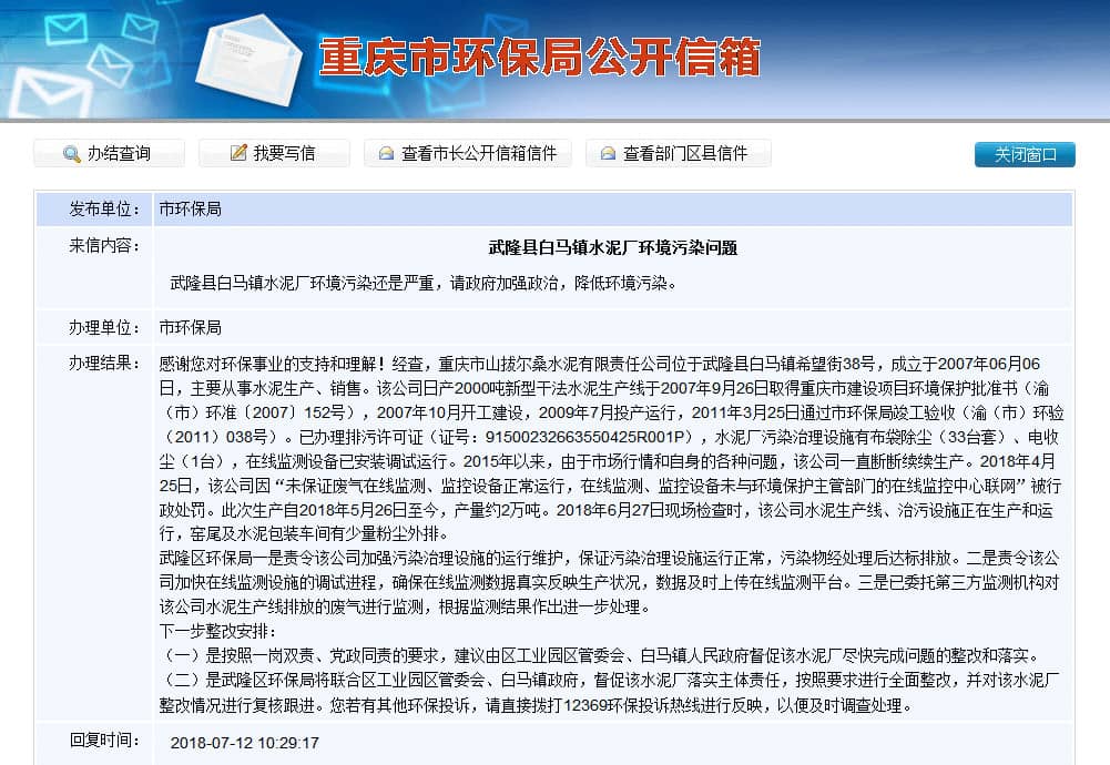 针对此事环保局组织相关调查后回复称,重庆市山拔尔桑水泥有限责任公司位于武隆县白马镇希望街38号,成立于2007年06月06日,主要从事水泥生产、销售业务。