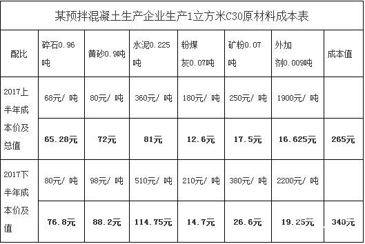 从上表可以算出,2017年上半年和下半年水泥、砂石骨料(碎石和黄砂)占总成本值的比重分别为30.57%、51.80%和33.75%、48.53%。水泥和砂石骨料进货价格变动对预拌混凝土生产成本影响较大。