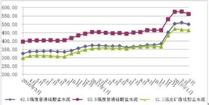 今年1-3月份42.5强度散装普通硅酸盐水泥价格分别为:502.33元/吨、510.47元/吨、500.07元/吨,价格冲高回落,52.5强度散装普通硅酸盐水泥价格分别为:574.20元/吨、576.07元/吨、561.67元/吨,价格也是冲高回落。