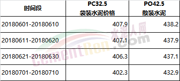 水泥价格方面,流通领域水泥市场价格变动不大,自6月1日至7月10日,水泥价格小幅下调。其中PC32.5袋装水泥下调1.37%,PO42.5散装水泥下调1.21%。详情如下: