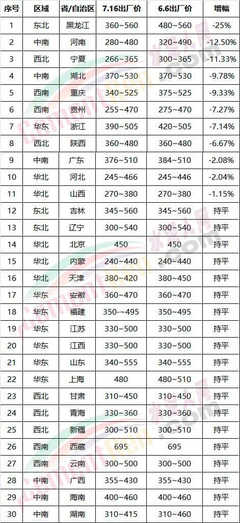 三北地区,东北地区,相对于其他地区,旺季来得晚一些。7-9月属于东北三省冬季较寒冷地区的旺季; 西北地区,因近期多雨,加之部分新建生产线影响,出货量较前期有所下降;华北地区,因区域重点项目雄安新区等正在加紧建设中,水泥销量与前期基本持平。
