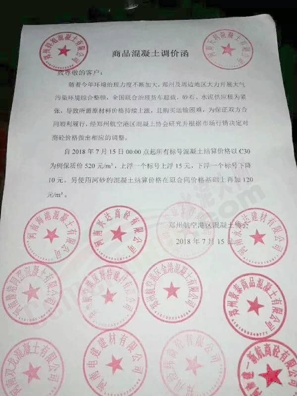 日前,郑州航空港区混凝土协会十四家商混企业集体发布商品混凝土调价函称,随着今年环境治理力度不断加大,郑州及周边地区大力开展大气污染环境综合整顿,全国联合治理货车超载,砂石、水泥供应极为紧张,导致所需原材料价格持续上涨,且购买运输困难,为保证双方合同顺利履行,经郑州航空港区混凝土协会研究并根据市场行情决定对商砼价格做出相应的调整。