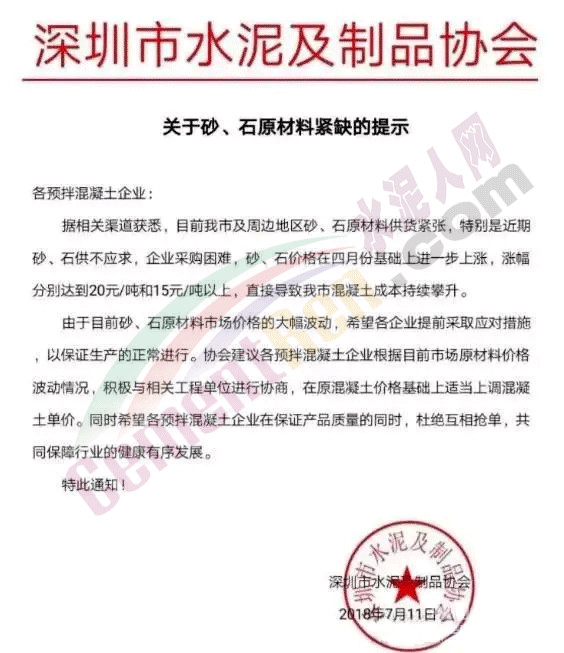 7月11日深圳水泥及制品协会发布关于砂、石原材料紧缺的提示,提示称据相关渠道获悉,深圳及周边地区砂、石原材料供货紧张,特别是近期砂、石供不应求,企业采购困难,砂、石价格在四月份基础上进一步上涨,涨幅分别达到20元/吨和15元/吨以上,直接导致深圳市混凝土成本持续攀升。由于目前砂、石原材料市场价格的大幅波动,协会希望各企业提前采取对应措施,以保证生产的正常进行。协会建议各预拌混凝土企业根据目前市场原材料价格波动情况,积极与相关工程单位进行协商,在原混凝土价格基础上适当上调混凝土单价。希望各预拌混凝土企业在保证产品质量的同时,杜绝互相抢单,共同保障行业的健康有序发展。