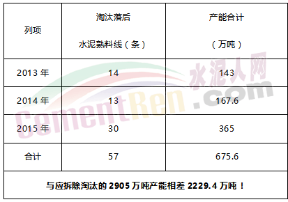 实际上,根据公告文件计算,2013年度云南省淘汰落后水泥熟料生产线14条产能143万吨,2014年度淘汰落后水泥熟料生产线13条产能167.6万吨,2015年度淘汰落后水泥熟料生产线30条产能365万吨。即,2012年底至2015年底以来,云南省共拆除淘汰落后产能仅675.6万吨,与应拆除淘汰的2905万吨产能相差2229.4万吨!公告拆除产能与按等量置换应拆除产能严重不符,如下表所示: