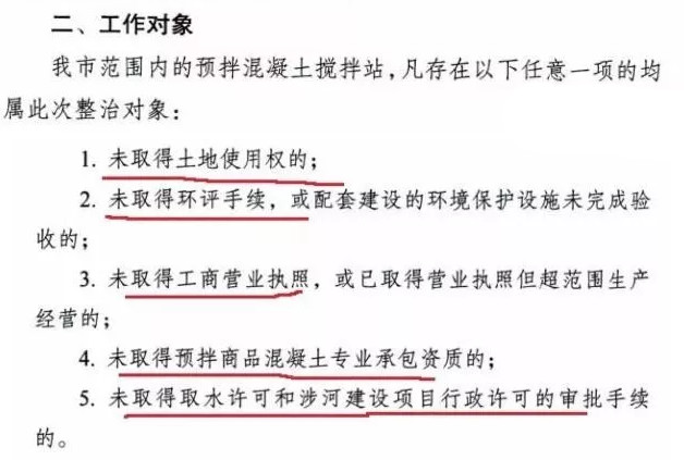 此次整治对象:(1)未取得土地使用权的;(2)未取得环评手续,或配套建设的环境保护设施未完成验收的;(3)未取得工商营业执照,或已取得营业执照但超范围生产经营的;(4)未取得预拌商品混凝土专业承包资质的;(5)未取得取水许可和涉河建设项目行政许可的审批手续的。