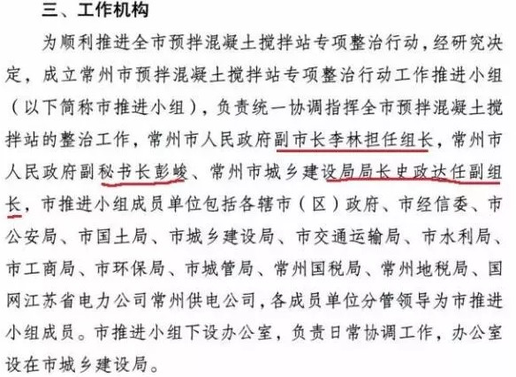 为顺利推进全市预拌混凝土搅拌站专项整治行动,成立常州市预拌混凝土搅拌站专项整治行动工作推进小组,常州市人民政府副市长李林担任组长。