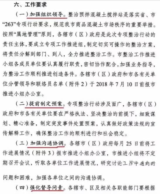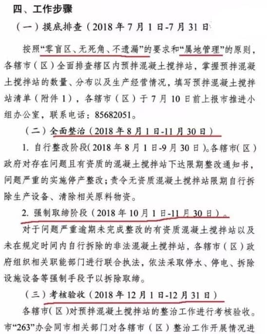 按照“全面排查、依法依规、限期到位”要求,从7月1日起,根据“属地管理、政府主导、部门联动”的原则,确保在今年12月底前,规范全市预拌混凝土搅拌站的生产经营行为,取缔一批不合法、不合规的预拌混凝土搅拌站。