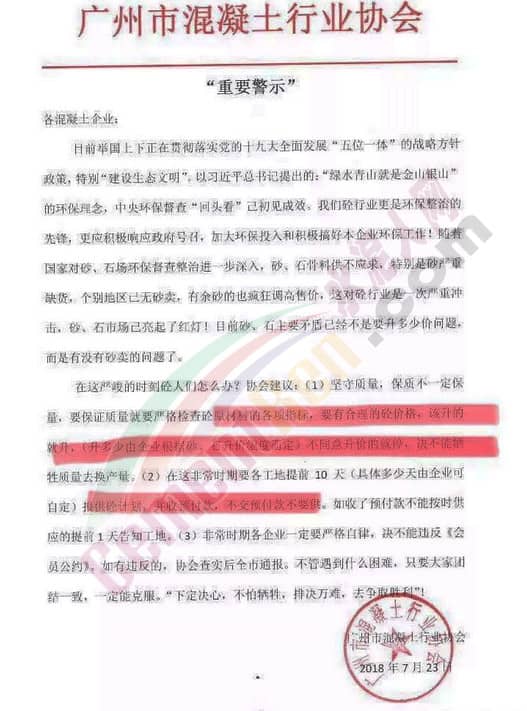 广州市混凝土行业协会发布“重要警示”称,随着国家对砂、石场环保督查整治进一步深入,砂、石骨料供不应求,特别是砂严重缺货,个别地区已经无砂可卖,有余砂的也疯狂调高售价,这对砼行业是一次严重冲击,砂石市场已亮起了红灯!目前砂、石主要矛盾已经不是升多少价问题了,而是有没有砂卖的问题了。