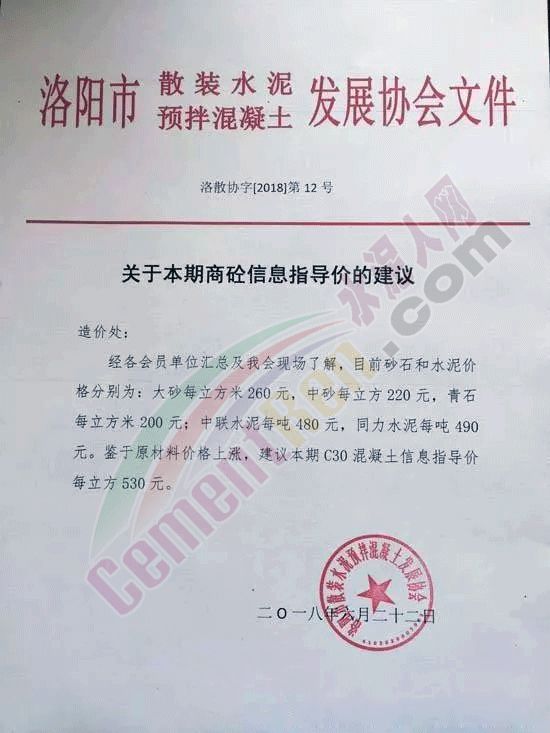 洛阳市散装水泥预拌混凝土发展协会发布关于本期商砼信息指导价的建议,建议称,经各会员单位汇总及协会现场了解,目前砂石和水泥价格分别为:大砂每立方米260元,中砂每立方220元,青石每立方200元,中联水泥480元/吨,同力水泥490元/吨,鉴于原材料价格上涨,建议本期C30混凝土信息指导价每立方530元。