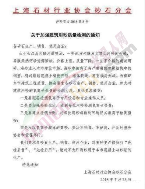 近日,上海市混凝土行业协会发布紧急通知,要求各预拌混凝土生产企业、预拌砂浆企业加大用砂的氯离子含量检测力度,禁止使用海砂用于生产。要求全市所有预拌混凝土生产企业、干混砂浆生产企业严把质量关,原材料要严格执行“先检后用”,绝对不允许海砂用于混凝土与砂浆的生产。