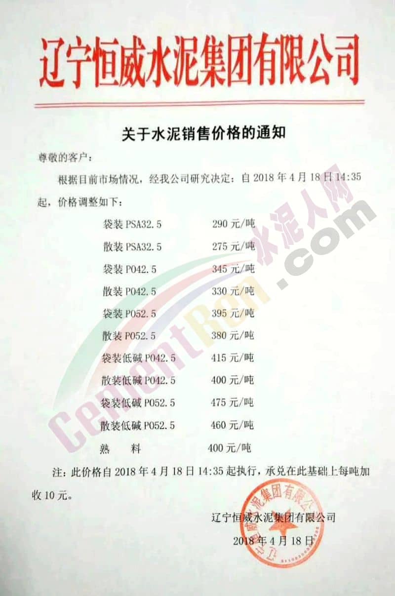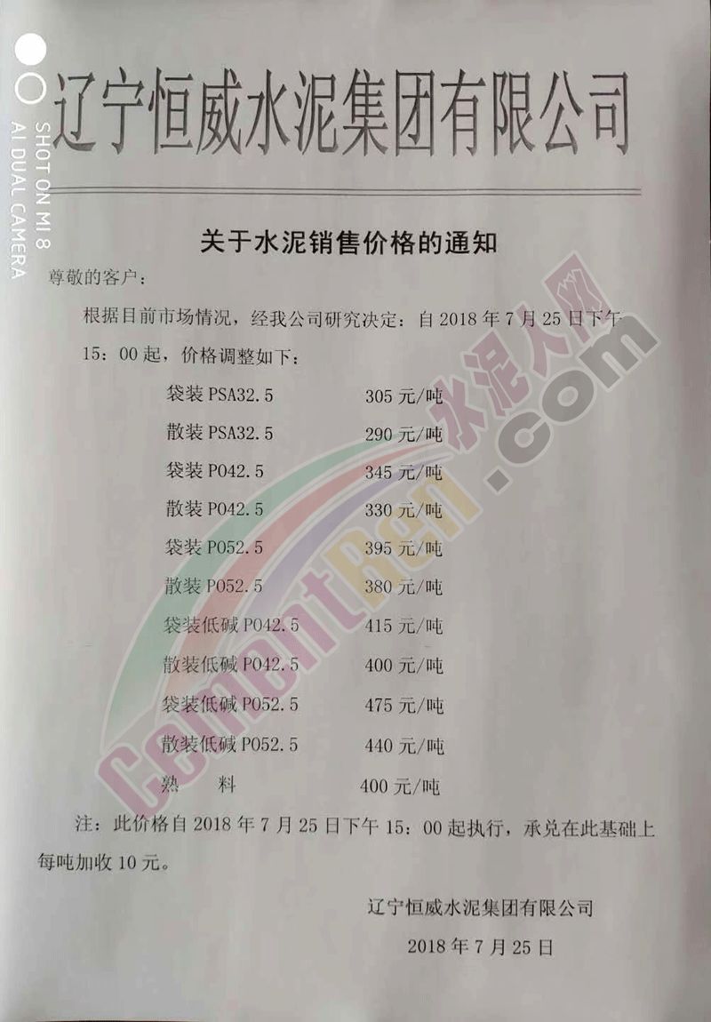【水泥人网】昨日(25日)辽宁恒威水泥集团有限公司发布关于水泥销售价格的通知,通知称,根据目前市场情况,经公司研究决定,自2018年7月25日下午15时起,调整各品种水泥产品价格。详情如下: