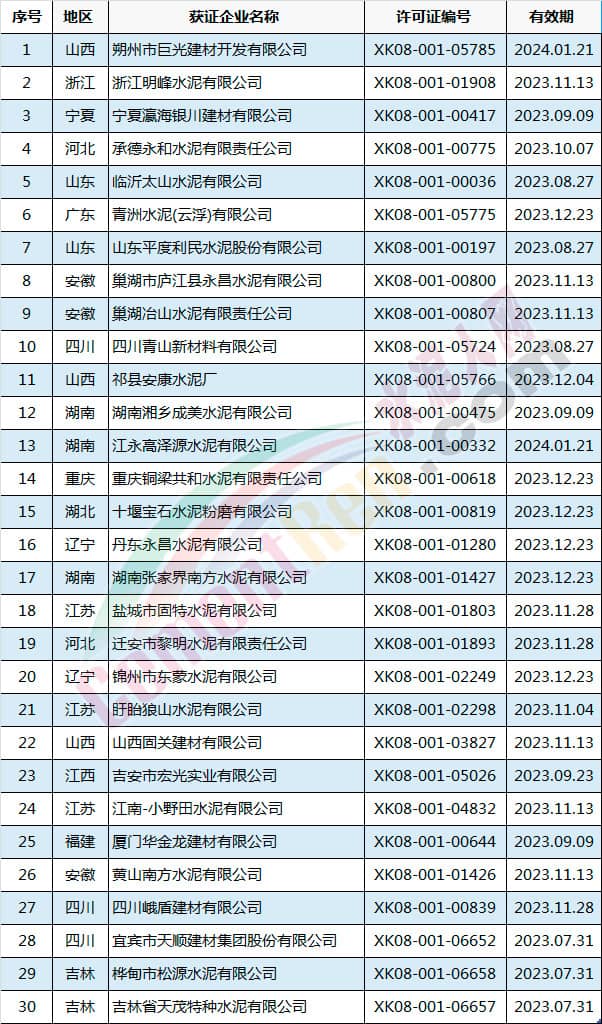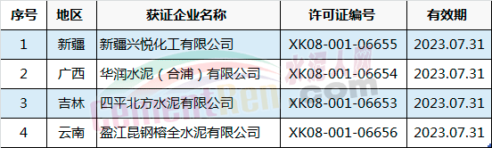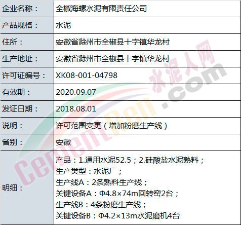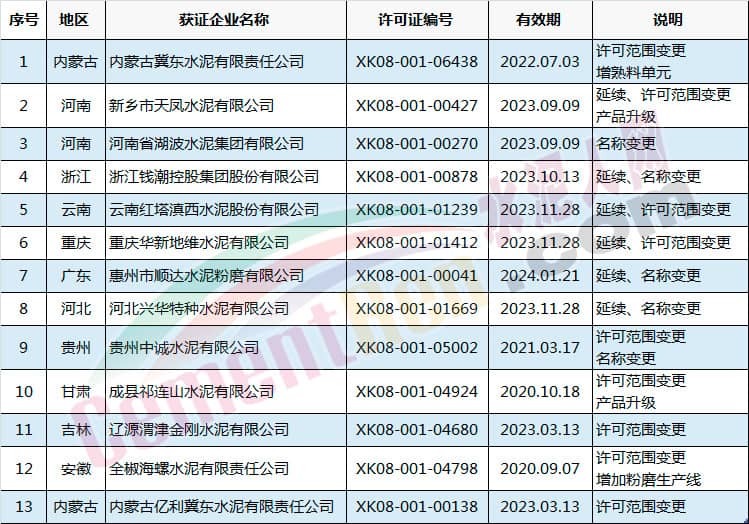 许可范围变更同时产品升级的有新乡市天凤水泥有限公司和成县祁连山水泥有限公司。涉及名称变更的共有5家企业,分别为河南省湖波水泥集团有限公司、浙江钱潮控股集团股份有限公司、惠州市顺达水泥粉磨有限公司、河北兴华特种水泥有限公司和贵州中诚水泥有限公司。