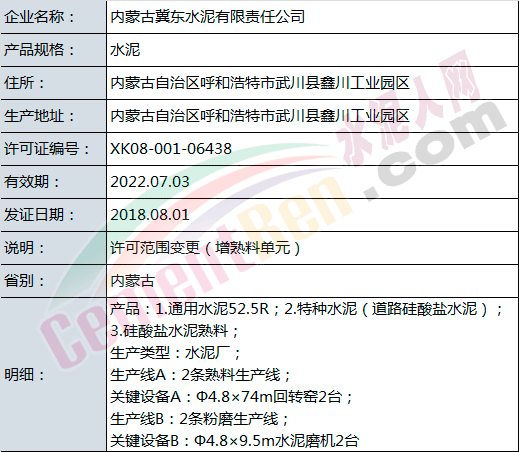 变更项目中,涉及许可范围变更的共有9家企业,其中内蒙古冀东水泥有限责任公司增加熟料单元。增加后:
