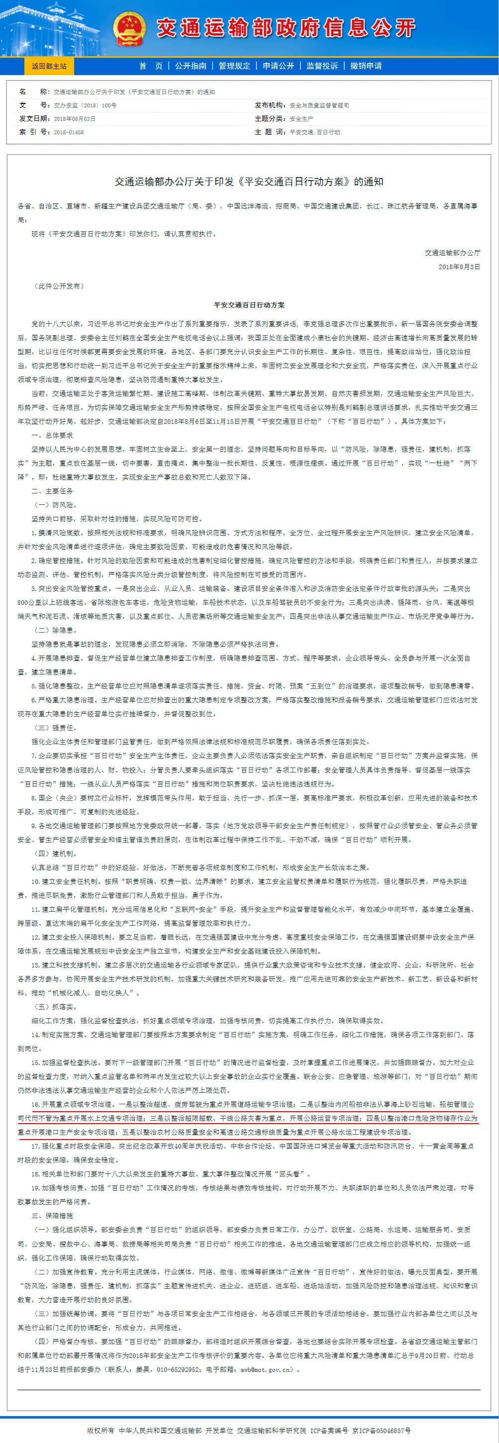 为切实保障交通运输安全生产形势持续稳定,交通运输部办公厅日前发布了《平安交通百日行动方案》(下称《方案》),决定自2018年8月6日至11月15日开展“平安交通百日行动”(下称“百日行动”)。