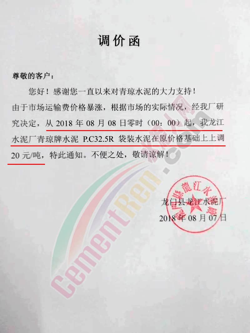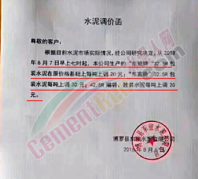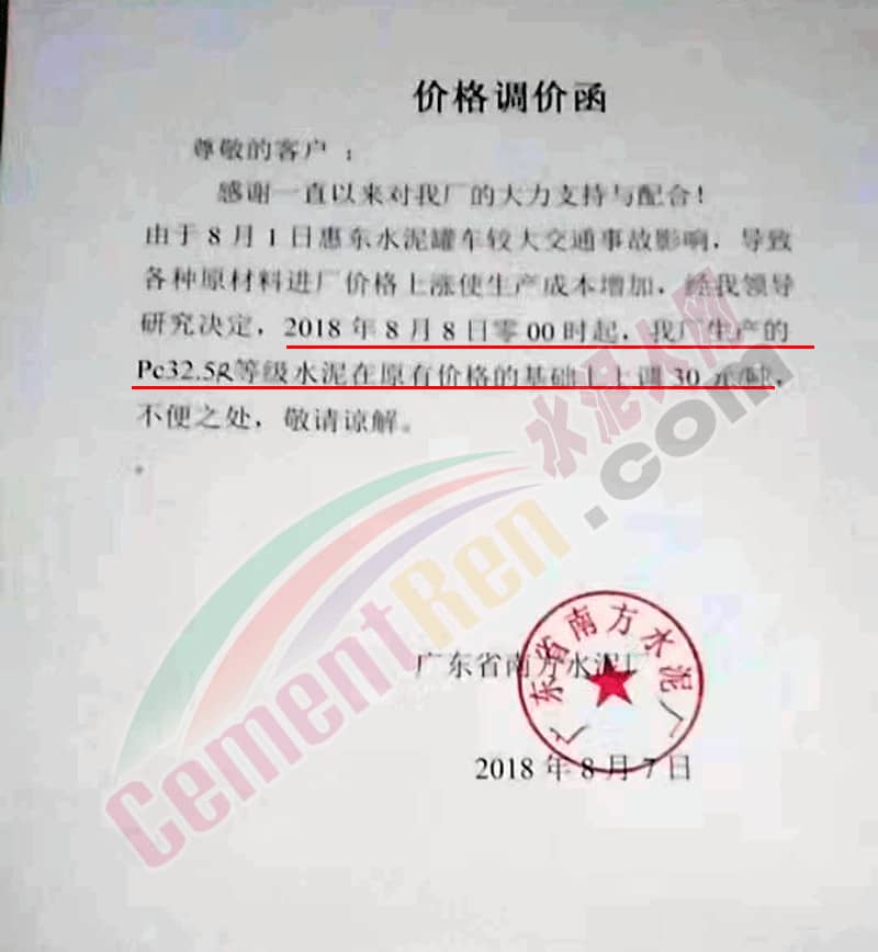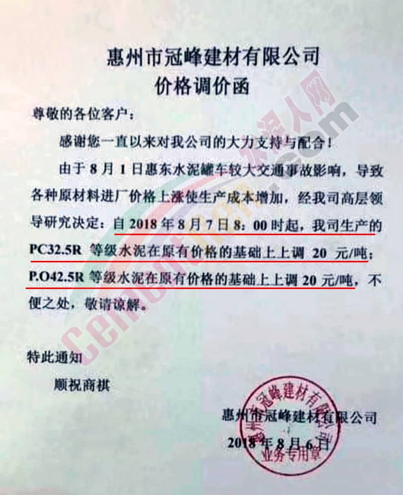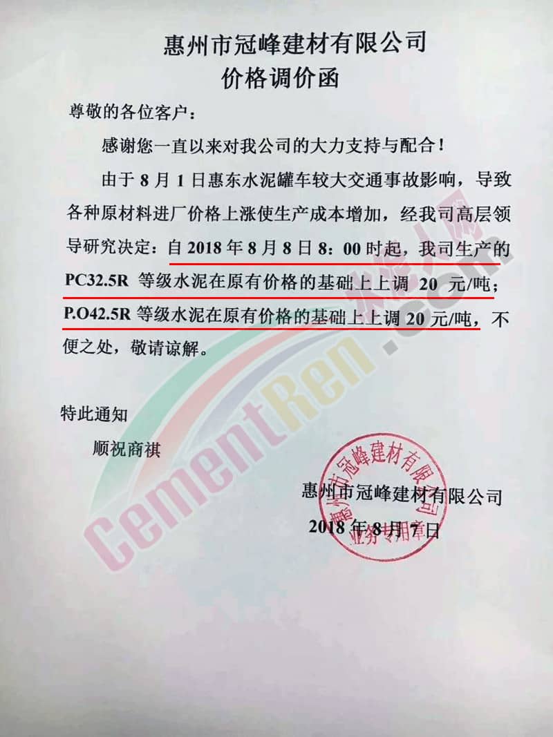 惠州市冠峰建材有限公司近两日连续发布了两次调价函,其中8月6日发布的涨价函称,由于8月1日惠东水泥罐车较大交通事故影响,导致各种原材料进厂价格上涨使生产成本增加,经公司高层领导研究决定,自8月7日早8点起上调PC32.5R和PO42.5R等级水泥价格,上调幅度在20元/吨。隔日又发通知称在原价基础上再涨20元/吨。