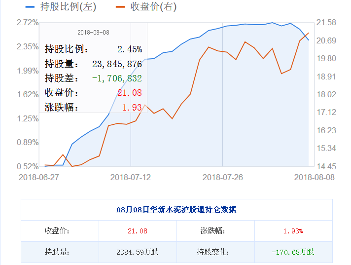 【水泥人网】数据显示,截至08月08日华新水泥于沪股通持股量为2384.59万股,占其A股股本比例为2.45%,比上一交易日减少170.68万股。 据数据统计,该股近一个月内累计涨幅为40.81%,沪股通累计加仓1277.70万,沪股通持仓累计变化比例为115.43%,近三个月内累计涨幅为43.14%,沪股通累计加仓2250.48万,沪股通持仓累计变化比例为1678.07%。