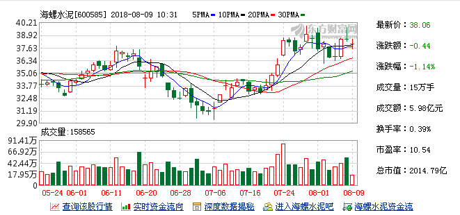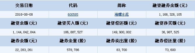 【水泥人网】海螺水泥(600585)2018-08-08融资融券信息显示,海螺水泥融资余额1,144,042,844元,融券余额22,283,261元,融资买入额186,887,527元,融资偿还额149,900,002元,融资净买额36,987,525元,融券余量578,786股,融券卖出量83,700股,融券偿还量73,600股,融资融券余额1,166,326,105元。海螺水泥融资融券详细信息如下表: