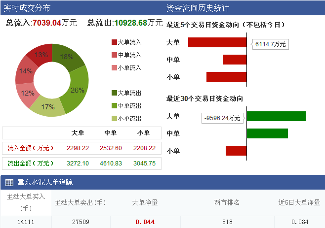 冀东水泥(000401)今日大单金额占总成交金额的 4.37%,近5日内资金净流入709.69万元,高于行业平均水平-306.69万元。