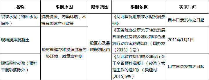 河北省推广、限制和禁止使用建设工程材料设备产品目录(2018年版)公示稿所列限制使用的建设工程材料设备中,袋装水泥(特种水泥除外)因浪费资源、污染环境,不符合国家产业政策,依据《河北省促进散装水泥发展条例》自目录发布之日起限制使用。