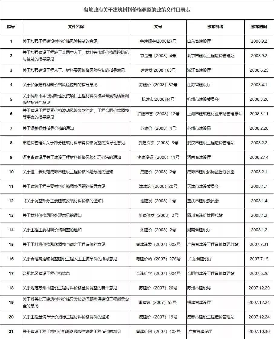 其实早在2007、2008年,因人工、材料(设备)、施工机械台班价格等出现持续大幅度的涨落,全国多个省份已出台文件就这类问题作出明确说明。大多数地区,在文件中详细列出了价差调整的幅度范围与方法。(因时间跨度较长,下表所列文件可能部分已失效,表中列出仅作参考,不具有实际指导作用!)