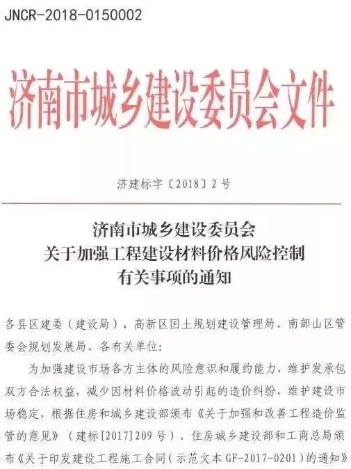 2018年1月30日,济南市住建委印发《关于加强工程建设材料价格风险控制有关事项的通知》(济建标字〔2018〕2号),明确工程计价中应推行风险共担和合理分摊原则,承包人应有限度承担材料价格等市场风险。