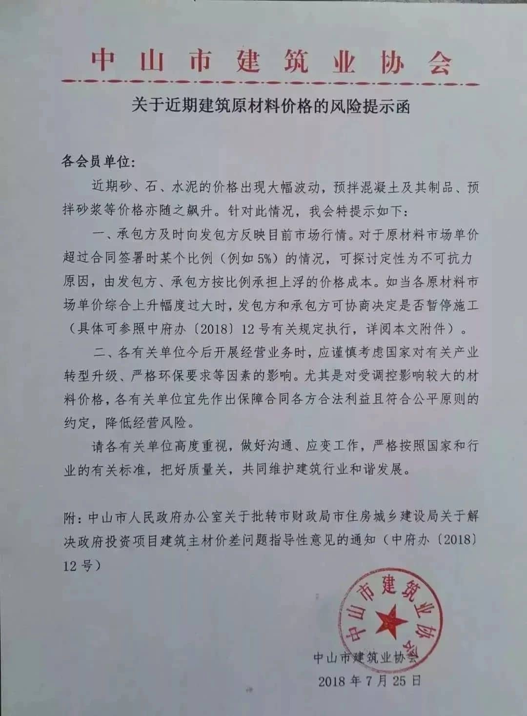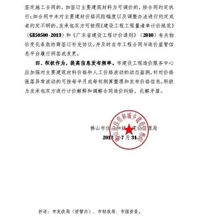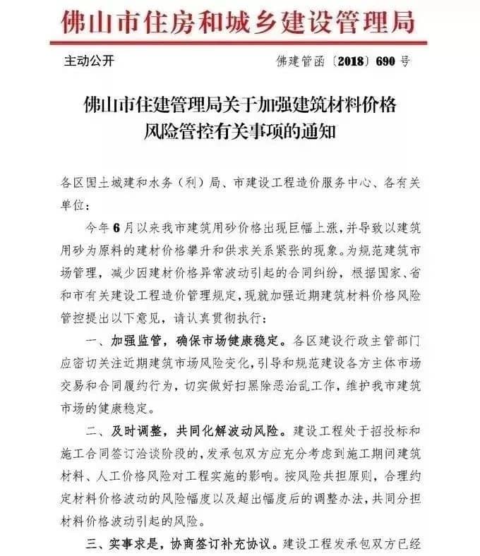 7月31日,佛山市住建管理局下发了《关于加强建筑材料价格风险管控有关事项的通知》,提出: