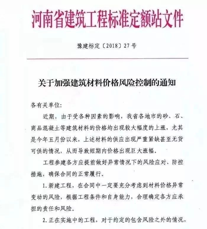 近日,河南省发布《关于加强建筑材料价格风险控制的通知》,对工程参建各方提出了应对异常情况的意见。