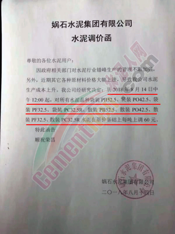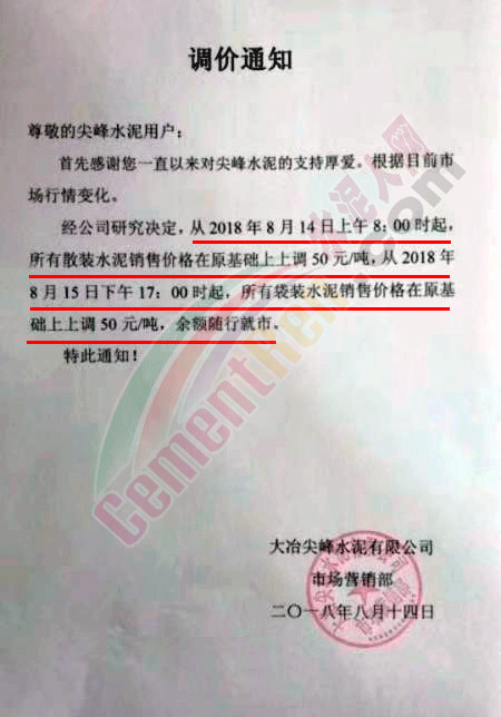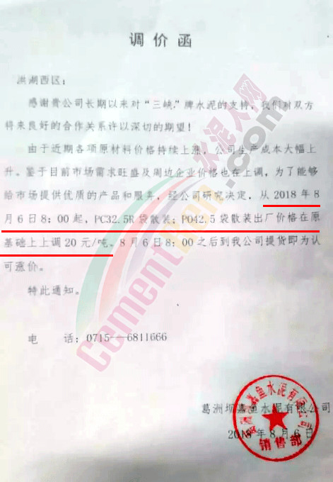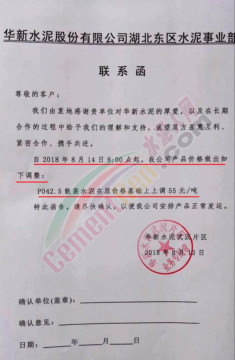 【水泥人网】继上周河南地区宣布全区域提价之后,湖北部分地区也通知客户上调出厂价格,涨幅在50-65元/吨。据水泥人网了解,目前区域内水泥熟料库位较低,加之进入八月中旬下游需求有所提升。调提价通知如下: