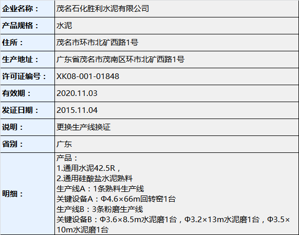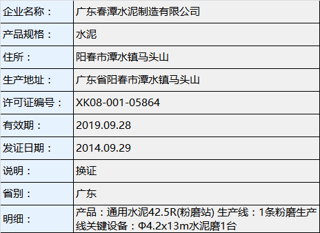 据查询,广东春潭水泥制造有限公司在2014年9月29日换领了生产许可证,生产线为1条粉磨生产线关键设备为Φ4.2x13m水泥磨1台。