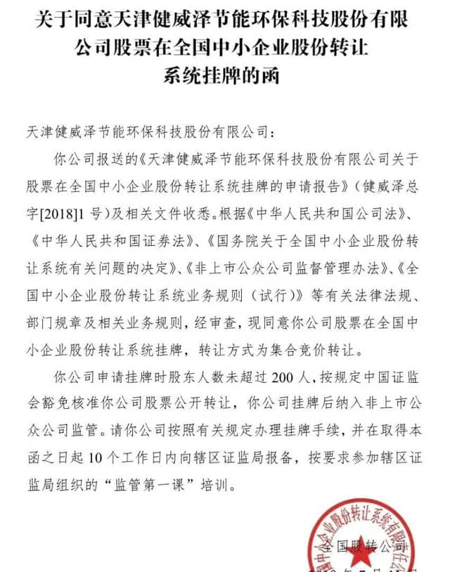 【水泥人网】据全国中小企业股份转让系统相关消息显示,国内余电发热工程领域的技术服务及改造领域的引领者,天津健威泽节能环保科技股份有限公司(以下简称“天津健威泽”)已于2018年7月31日起成功在新三板挂牌,这是天津健威泽的里程碑。在今后的发展过程中,天津健威泽将会加大在技术研发,用户服务、社会责任方面的投入,切实回报用户、回报各大股东,实现企业利益最大化。