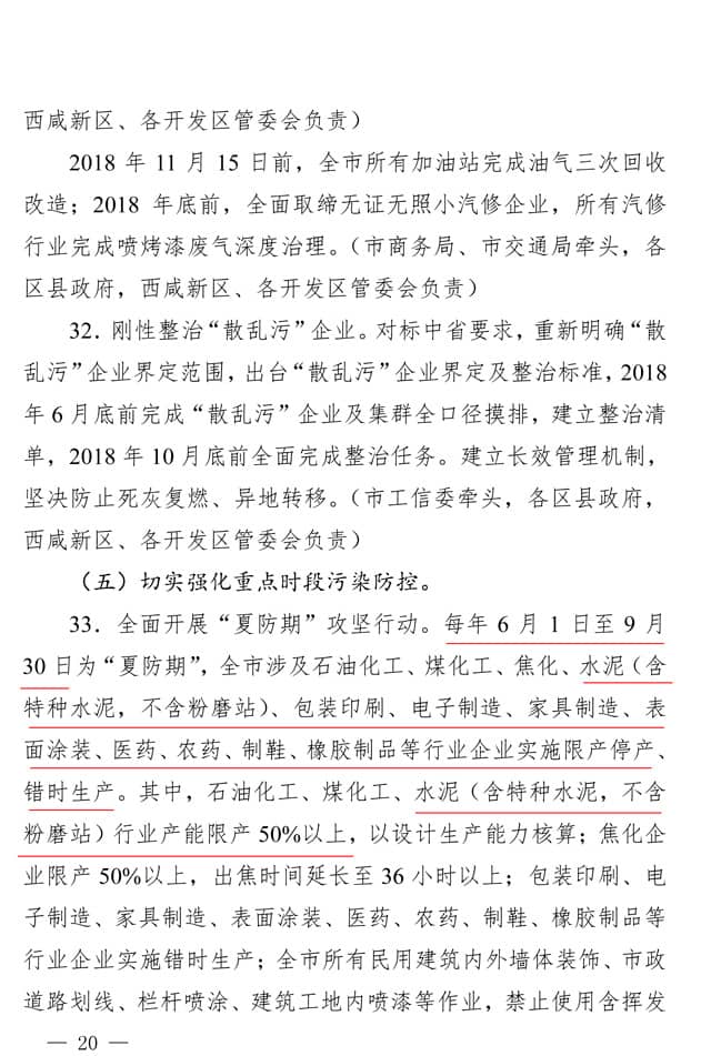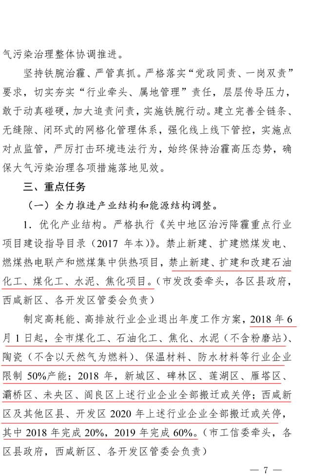 按照计划,2018年6月1日起,西安全市煤化工、石油化工、焦化、水泥(不含粉磨站)、陶瓷(不含以天然气为燃料)、保温材料、防水材料等行业企业限制50%产能。2018年,城市六区及阎良区上述行业企业全部搬迁或关停。西咸新区及其他区县、开发区2020年上述行业企业全部搬迁或关停。到2020年,基本建成“无煤化”城市。