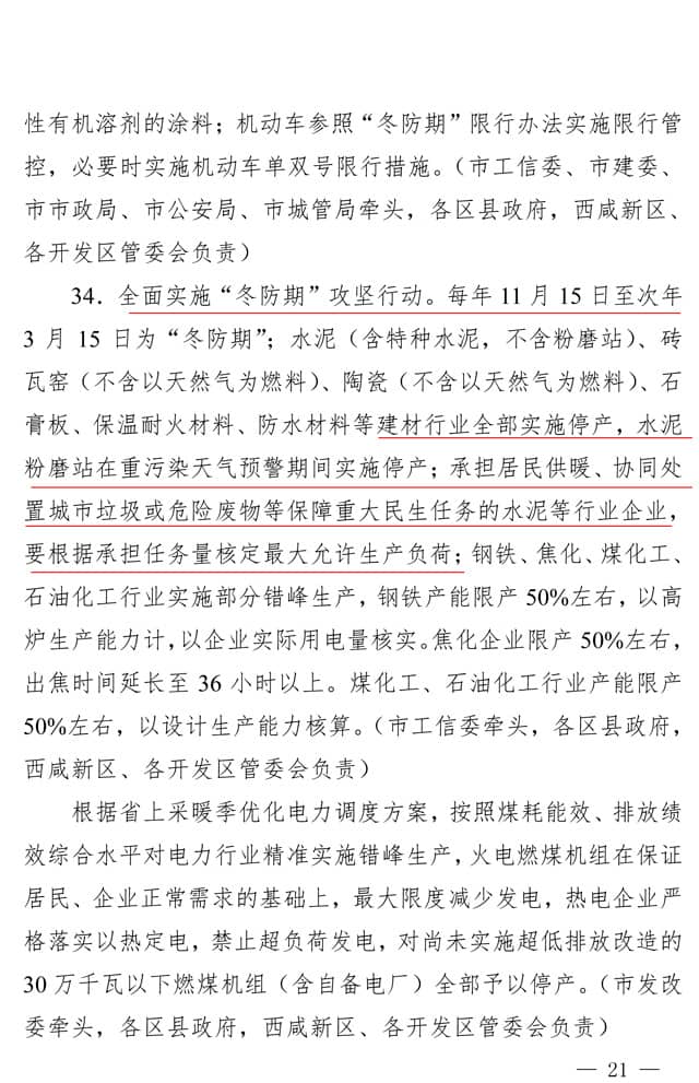 全面实施“冬防期”攻坚行动。每年 11 月 15 日至次年 3 月 15 日为“冬防期”;水泥(含特种水泥,不含粉磨站)、砖瓦窑(不含以天然气为燃料)、陶瓷(不含以天然气为燃料)、石膏板、保温耐火材料、防水材料等建材行业全部实施停产,水泥粉磨站在重污染天气预警期间实施停产;承担居民供暖、协同处置城市垃圾或危险废物等保障重大民生任务的水泥等行业企业,要根据承担任务量核定最大允许生产负荷;钢铁、焦化、煤化工、 石油化工行业实施部分错峰生产,钢铁产能限产 50%左右,以高 炉生产能力计,以企业实际用电量核实。焦化企业限产 50%左右, 出焦时间延长至 36 小时以上。煤化工、石油化工行业产能限产 50%左右,以设计生产能力核算。