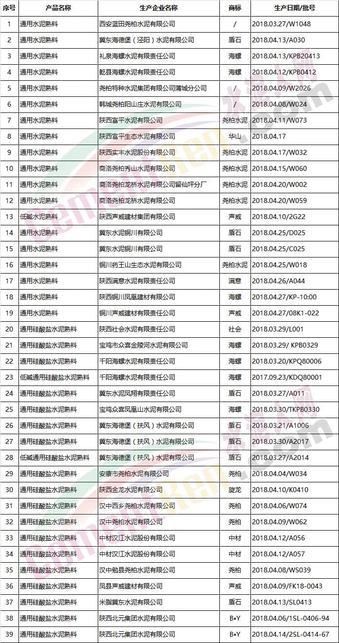 本次硅盐酸水泥熟料产品样品在西安、咸阳、渭南、铜川、商洛、宝鸡、安康、汉中、延安、榆林等地区的生产企业中抽取,共抽查生产企业33家,抽取样品39批次,经检验,合格样品39批次,样品合格率为100.00%。