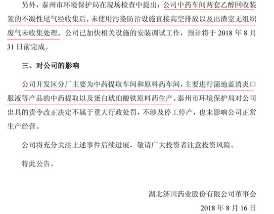 企业上市公司8月16日公告显示,2018年7月3-4日,泰州市环境保护局对公司废水、废渣及废气的处理情况进行了现场检查。根据《泰兴市环境监测站监测报告(环监(气)字(2018)第(074)号)》,济川药业集团有限公司废气排放口(西厂)非甲烷总烃排放浓度均值超标0.08倍。