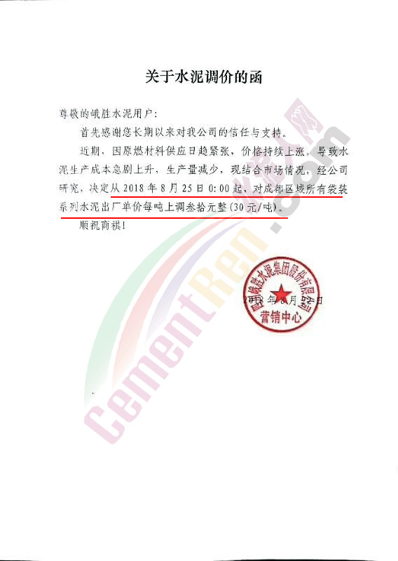 峨胜水泥关于水泥调价的函称,近期因原燃料供应日趋紧张,价格持续上涨,导致水泥生产成本急剧上升,生产量减少,现结合市场情况,经公司研究,决定从2018年8月25日0点起,对成都区域所有袋装系列水泥出厂单价每吨上调30元/吨。