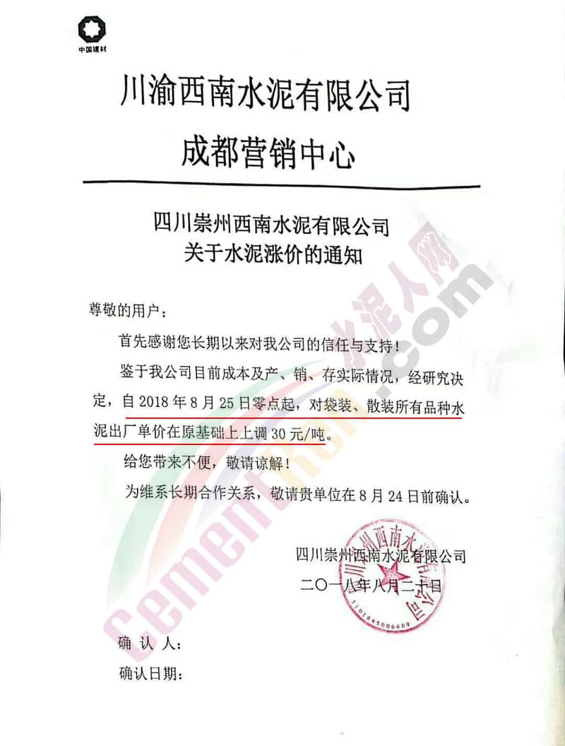 川渝西南水泥有限公司成都营销中心四川崇州西南水泥有限公司发布水泥涨价的通知,鉴于公司目前成本及产、销、存实际情况,经研究决定 ,自2018年8月25日零点起,对袋装、散装所有品种水泥出厂单价在原基础上上调30元/吨。