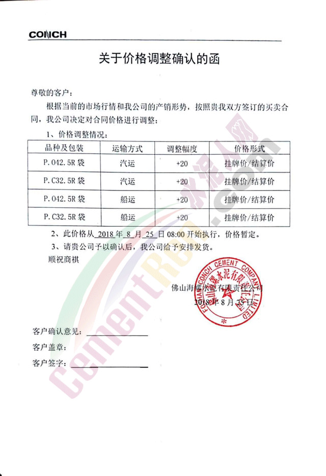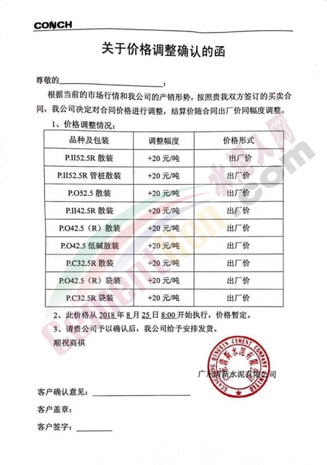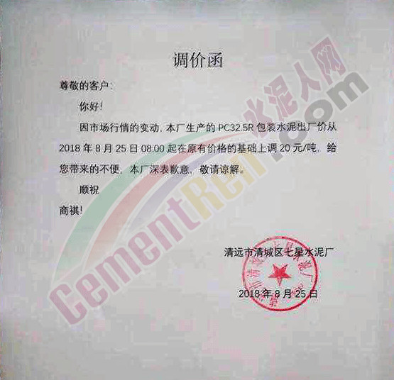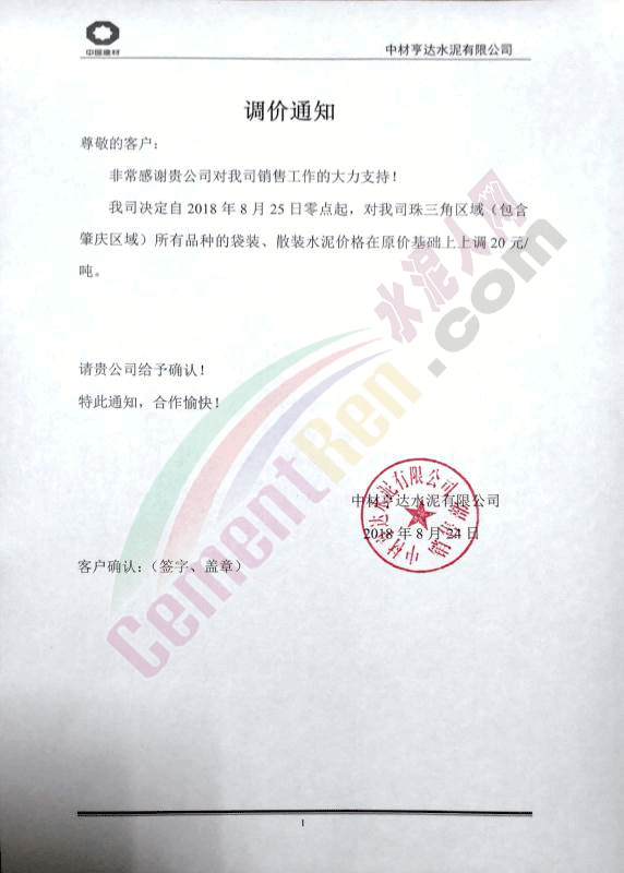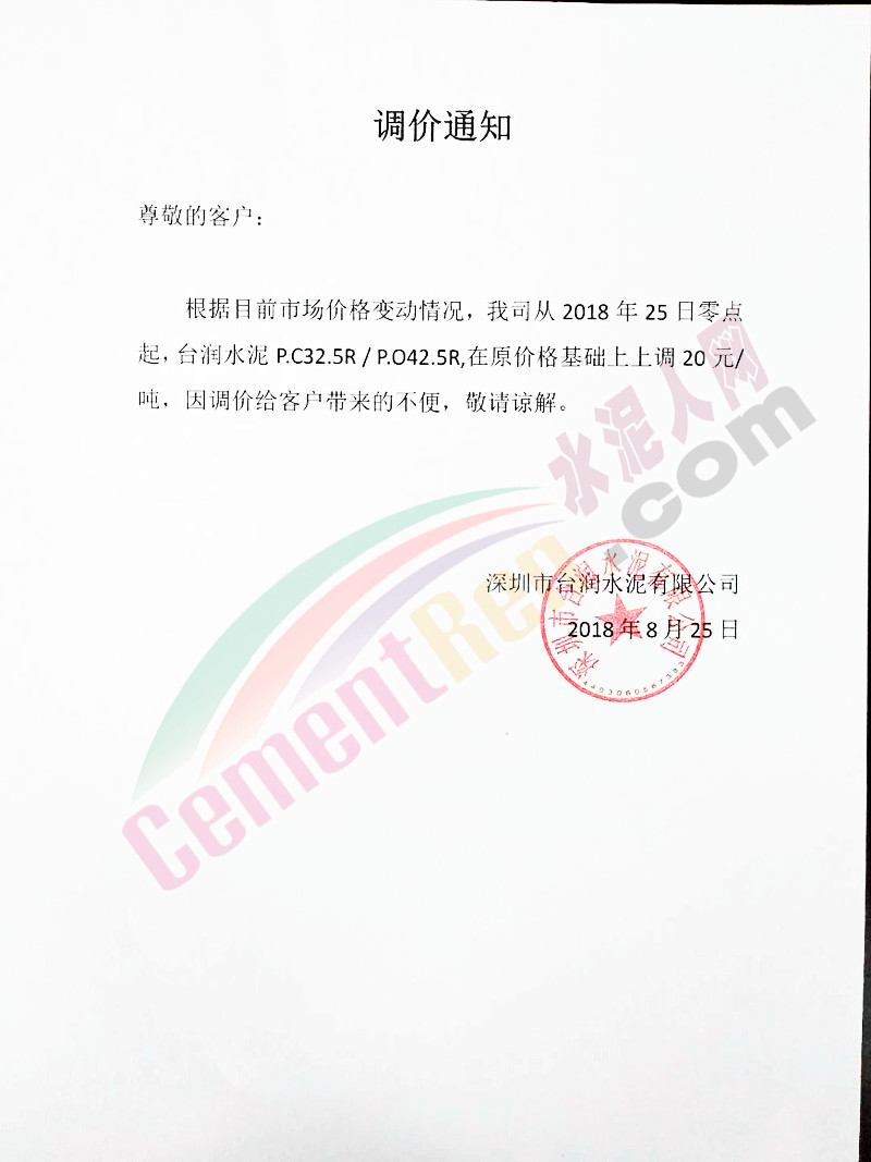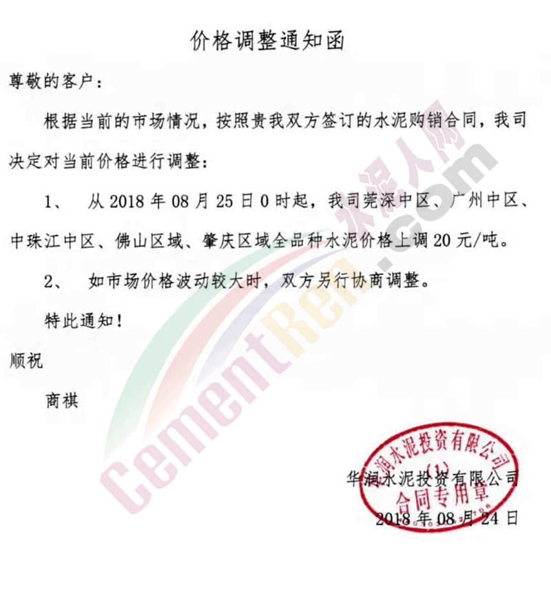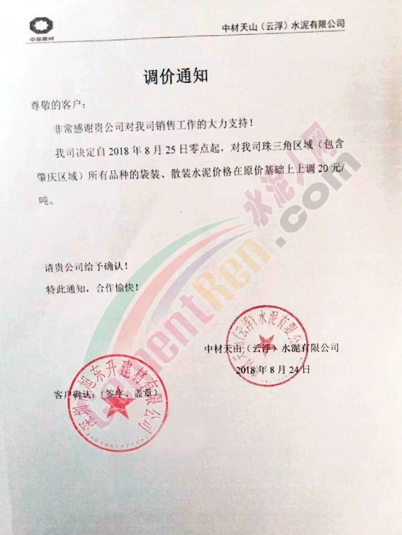 【水泥人网】近两日广东珠三角区域多家企业发布提价通知称上调水泥价格。 一、海螺水泥(三家工厂) 英德海螺、清新海螺、佛山海螺发布提价通知,自2018年8月25日起各标号水泥在原价基础上上调20元/吨。 二、台泥英德 三、华润水泥 四、中材亨达 五、英红华侨水泥 六、石井德庆水泥 七、七星水泥厂 八、越堡水泥 九、中材天山(云浮)水泥 十、深圳市台润水泥