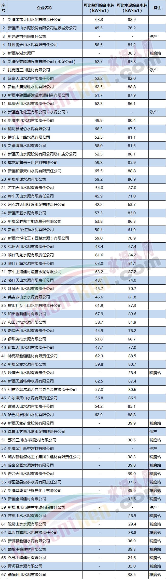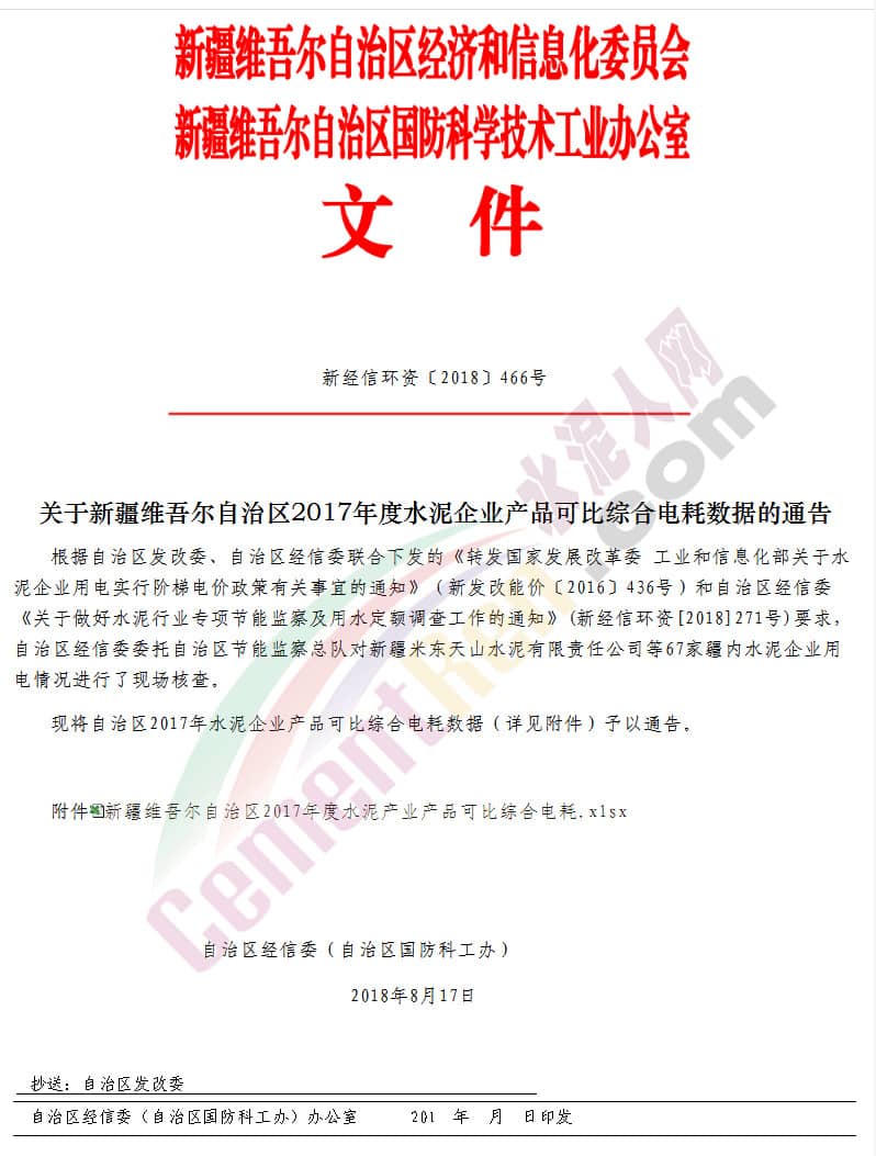 【水泥人网】新疆维吾尔自治区经济和信息化委员会发布《关于新疆维吾尔自治区2017年度水泥企业产品可比综合电耗数据的通告》通告称: