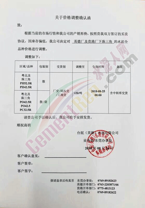 广州市越堡水泥有限公司,广州市珠江水泥有限公司调价确认书称,根据目前的市场情况,从2018年8月25日零时起,公司水泥价格全区域全品种上调20元/吨。