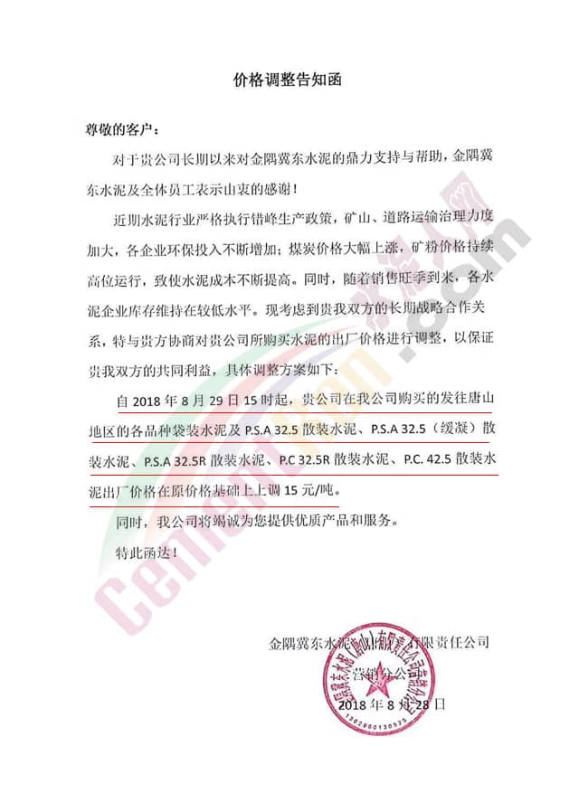 自8月29日15时起,客户在公司购买的发往唐山地区的各品种袋装水泥及P.S.A 32.5散装水泥、P.S.A 32.5(缓凝)散装水泥、P.S.A 32.5R散装水泥、P.C 32.5R散装水泥、P.C 42.5散装水泥出厂价格上调15元/吨。