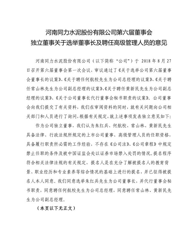 会议同时选举朱红兵、李明、崔星太、张东红、陈兰为同力水泥第六届董事会董事;李伟真、徐步林、曹胜新为同力水泥第六届董事会独立董事。