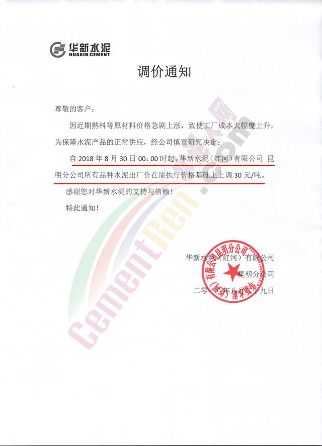 区域主导企业华新水泥(红河)有限公司调价通知称,因近期熟料等原材料价格急剧上涨,致使工厂成本大幅度上升,为保障水泥产品的正常供应,经公司慎重研究决定,自今日(8月30日)零点起红河公司 昆明分公司所有品种水泥出厂价在原执行价格基础上上调30元/吨。